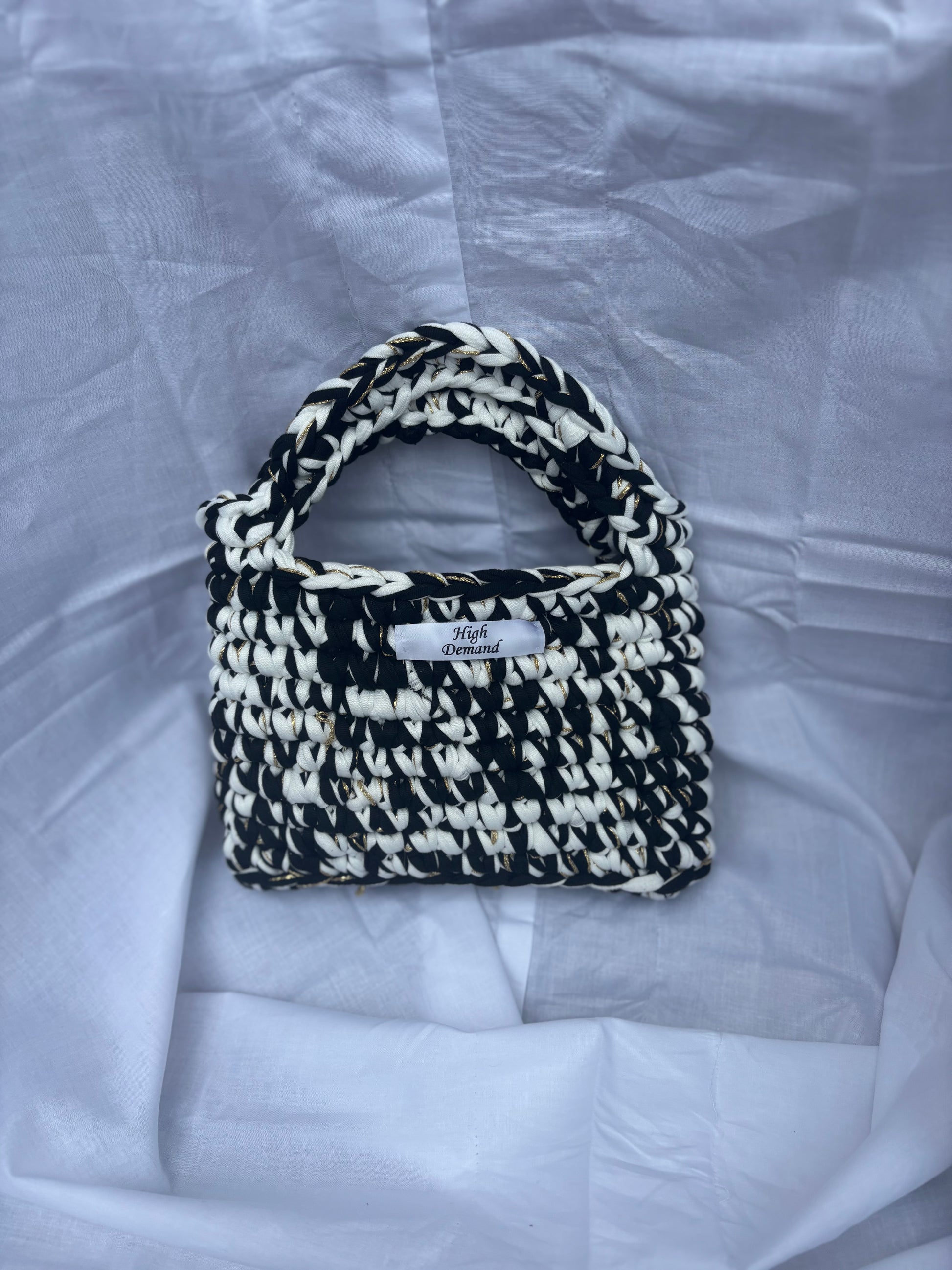 The florence bag is a handheld bag, perfect for everyday essentials. The Florence bag is made using recycled tshirt yarn to create a sustainable slow fashion bag.